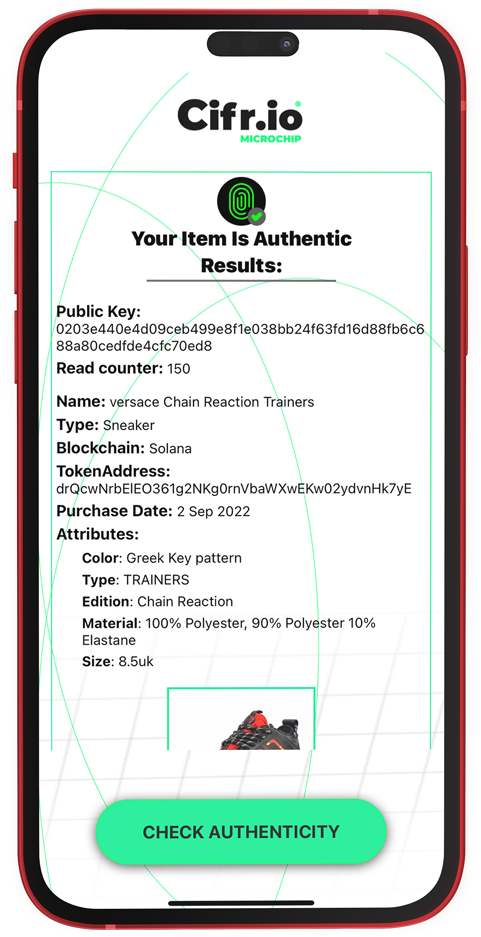 Using the Cifr app, consumers can quickly and easily validate the Cifr chip and check the authenticity of physical products.
